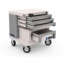 В комплектацию тележки Comtex №4 входит: тележка Comtex с колесами и ручкой, тумба малая Comtex 1, три ящика 60 Comtex. Тумба малая Comtex 1 комплектуется одним выдвижным ящиком, который закрывается ключевым замком. Полезные размеры ящика 60 Comtex - 64х470х420 мм. Стойки тележки имеют телескопическую конструкцию, что позволяет изменить высоту стойки от 442 до 842 мм с шагом 44,45 мм. На задней стенке тележки предусмотрены кабелепроводы и вентиляционные отверстия. Ручку для перемещения тележки возможно устанавливать с двух сторон. Колеса полиуретановые диметром 125 мм (2 неповоротных, 1 поворотное, 1 поворотное с тормозом). Цвет: серый Ral 7035, стойки тележки - темно-серые Ral 7046. Тележка поставляется в собранном виде