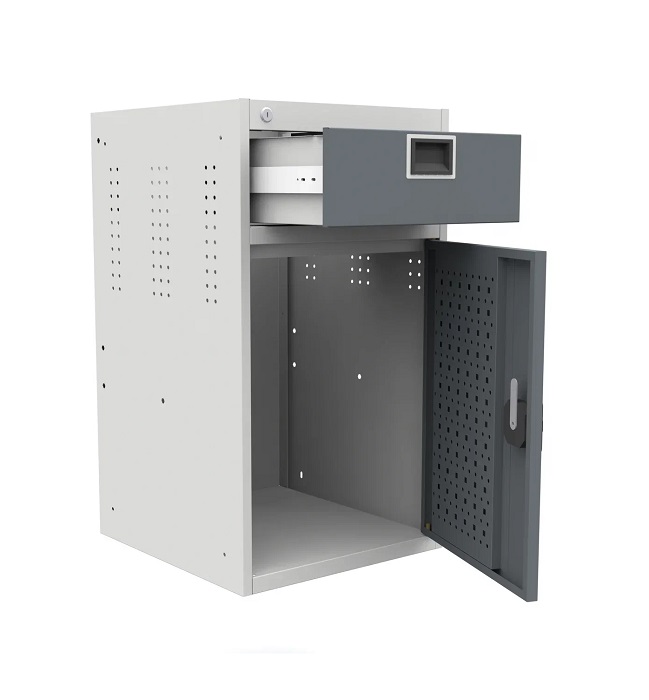 В комплектацию верстака входит: столешница 1280 SMART, тумба SMART 4, тумба SMART 1-1, тумба-пенал SMART один перфорированный экран SMART 1280, комплект косынок для экрана SMART. Столешница выполнена из фанеры 27 мм со стальной окрашенной накладкой 1,2 мм. Тумба SMART 4 комплектуется 4 выдвижными ящиками. Выдвижные ящики оборудованы телескопической системой полного выдвижения ящиков с фиксацией в закрытом состоянии (50000 циклов). Тумба SMART 1-1 комплектуется одной дверью, одним выдвижным ящиком и регулируемой по высоте полкой. Тумба-пенал SMART выдвигается на четырех телескопических направляющих и предназначена для хранения крупногабаритных инструментов и аксессуаров. Все тумбы закрываются ключевым цилиндровым замком. Секретность замка 2000 комбинаций (2 ключа в комплекте). Внутренние стенки дверей и перфорированный экран имеют универсальную перфорацию для размещения навесных элементов. Шаг квадратной перфорации (10 мм) - 38х38 мм, круглой (7 мм) - 25х38 мм. Возможна смена стороны открывания двери тумбы. Цвет верстака: корпус тумб - серый Ral 7035, столешница, двери тумб, лицевая панель ящиков - антрацит Ral 7016. Поставляется в разобранном виде.