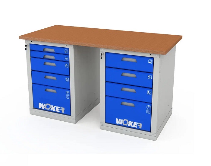 В комплектацию верстака входит: столешница Woker 1500, одна тумба Woker 04, одна тумба Woker 05. Столешница выполнена из шлифованной березовой многослойной фанеры толщиной 30 мм. Снаружи фанера обработана влагостойким антисептиком цвета "красное дерево", что придает фанере повышенную влагостойкость и более темный цвет. Тумба Woker 04 комплектуется 4 выдвижными ящиками (3 высотой - 135 мм и 1 высотой - 275 мм). Тумба Woker 05 комплектуется 5 выдвижными ящиками (2 высотой - 135 мм, 2 высотой - 65 мм и 1 высотой - 275 мм). Полезный размер ящика: (ШхГ) 459х612 мм. В ящиках есть противоскользящие коврики и набор наклеек с пиктограммами для маркировки содержимого.